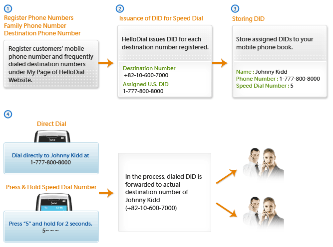 After the caller registers destination numbers at HelloDial’s Website, he/she then stores DIDs (given per each destination) to speed dial settings of mobile phone. If preferred, caller may store DIDs in phone book instead. Either way, use of calling card has never been so simple until HelloDial.